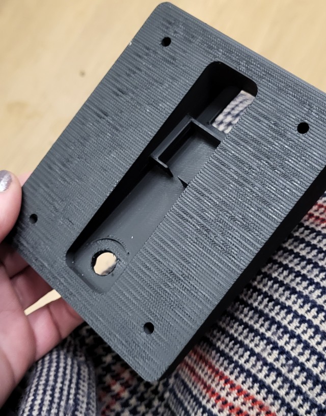 The 3D print shown here is Rob's custom design for the housing. Its wedge shape fits neatly inside the roof of the birdbox. There's a motion sensor, set at a slight angle to detect movement at the entrance to the box. At the other end there's space for a temperature-humidity sensor, and plenty in between. The top part of the housing is still a careful design progress - early iterations of the birdbox have shown Rob the need for bug-proof innards!